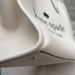Chic kate spade tote in white. Stylish and versatile for any outfit. Small black mark on front and bottom. I have not tried cleaning. Interior could use cleaning. Zipper works and overall great bag. No returns.