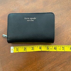 This is a compact wallet bought at the kate spade store in Disney Springs in 2020. It measures 6x4 inches and is black pebbled leather with a pink cloth inside. Lightly used but no stains or damage.