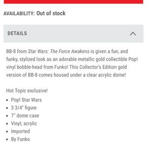 BB-8 COLLECTOR'S EDITION VINYL BOBBLE-HEAD HOT TOPIC EXCLUSIVE. Out of box but in excellent condition. Lmk if you need more pics. Feel free to make an offer 💕