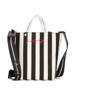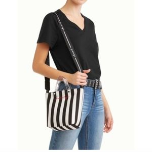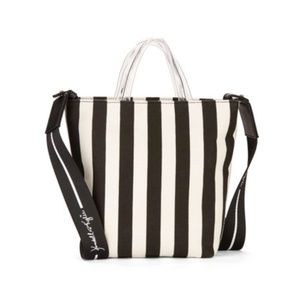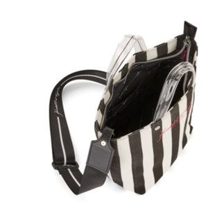 black and white stripe mini tote with strap. lucite handles and red logo writing on the front. black and white strap included. NWT. zip top with inner pocket. canvas exterior.