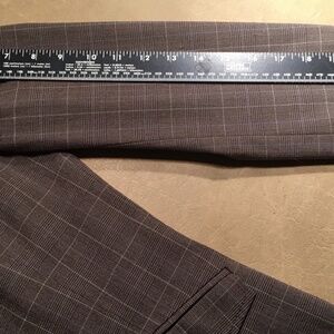 Brown/Blue combination GLEN PLAID/WINDOWPANE pattern; 63% Polyester, 33% Rayon, 4% Spandex, has some STRETCH; fully lined,100% acetate; 3-button closure; long sleeves with 3-button accent/trim at cuffs; 3 mock pockets w/flaps; rear vent; tapered/fitted with princess seaming.