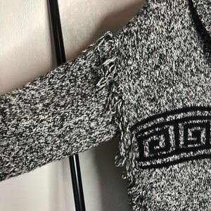 Size small. Cowl neck. Very stretchy. Pullover style. Long sleeves. Fringe on the sleeves and across the body.