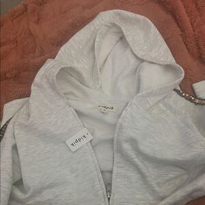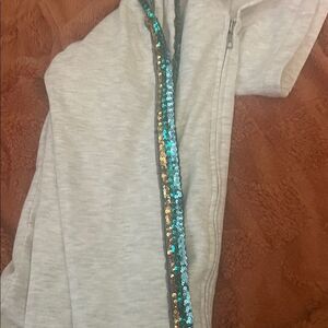 Stylish light gray jacket with zip closure. Features sequin detail on sleeves. Ideal for layering.