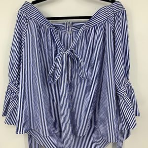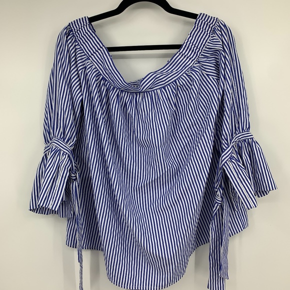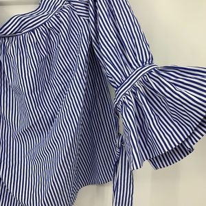 kimchi blue small blouse stripes off shoulder tie knot sleeves curved hem cotton