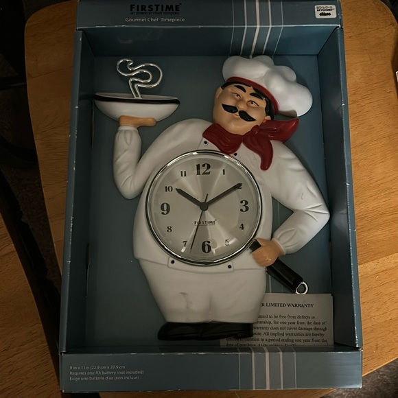 Gourmet chef, time, piece, kitchen, clock. Bed Bath and beyond original the clock face is glass while the chef is plastic.
