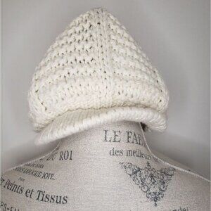 Handmade cream coloured chunky knit newsboy style brimmed winter cap.