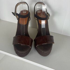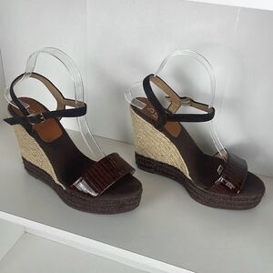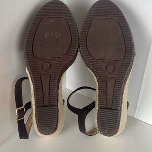 Material: No material tag but these appear to be suede leather ankle straps with patent leather toe straps, jute wrapped wedges and man made bottoms.