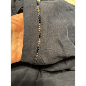 The product is a Kobi Halperin solid navy blue long sleeve button down linen top in size large. This stylish blouse is designed for women and features a classic solid pattern, making it a versatile and elegant addition to any wardrobe. Made from high-quality linen fabric with a down feel, this top is not only fashionable but also comfortable and breathable, perfect for everyday wear or special occasions. The long sleeves and button-down style add a touch of sophistication to the overall look, making it a timeless piece for any woman's closet.