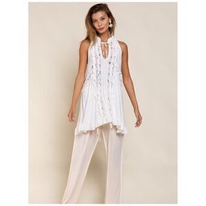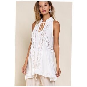 Lace Paneled Ruffle Detailed Sleeveless Swing Top In Ivory