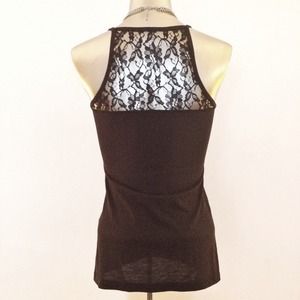cute black v neck tank with lace trim at front and large lace panel in back. spaghetti straps.