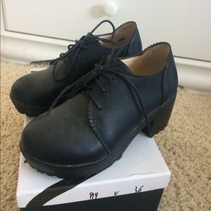 super cute black lace-up platform shoes. 2.5 inch block heel and 1.25 inch platform, which makes them super comfortable! faux-leather finish with a pretty scalloped hem (pictured). reasonable offers always considered!