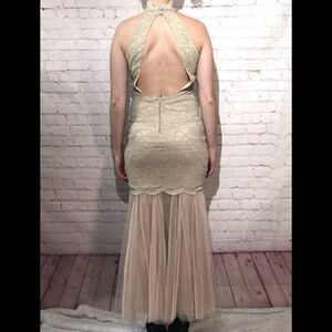 Size 5/6 Cream lace halter dress with a open back, partial zip back and a tule bottom. Good condition, smoke free home