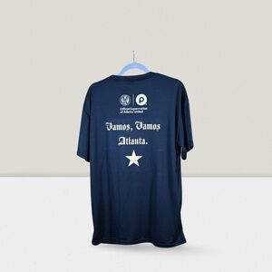 Show your team spirit with this sleek black Atlanta United tribute shirt! Features a bold golden “Vamos, Vamos Atlanta” on the back for a standout look. Perfect for game days, casual wear, or supporting ATL in style. Comfortable, lightweight, and packed with fan pride—must-have for any supporter!