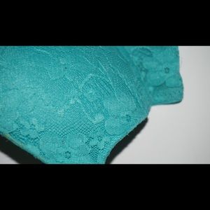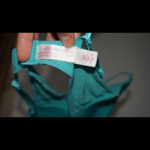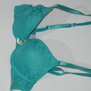 Teal bra. 32A . The texture is laced all over and it's pretty comfortable. I wore it 2-3 times but unfortunately it's too small now,