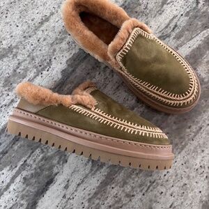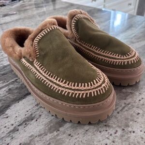 Designed for ease and warmth, the Jun 4.0 slipper in fern suede features contrast hand crochet detailing and a soft shearling interior. Set on a flexible EVA rubber sole, it combines traditional craftsmanship with quiet functionality.