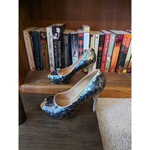 l.a.m.b. peeptoe tan leather silver sequin stilleto sz 7.5 excellent condition