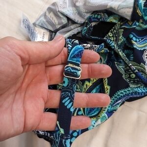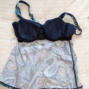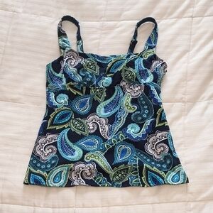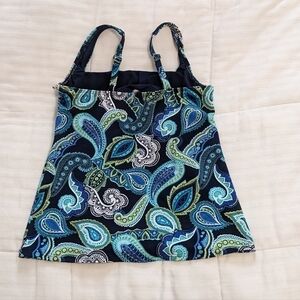 lands' End Paisley patterned swimsuit top size 2. the main color is very dark blue almost black and the pattern is lighter blue screens and yellows. it has two very sturdy adjustable straps and flexible underwire cup. this is in great condition. I have another bathing suit top in the same brand and size but a different color and I offer 50% off of any bundle of two items or more so bundle and Save.