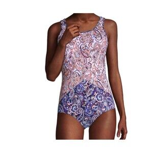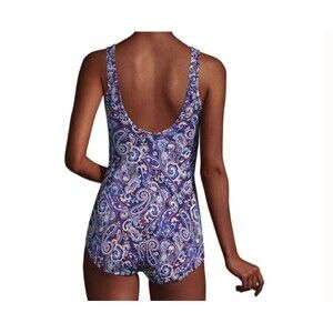 The Lands' End swimsuit is a new one-piece design in a size 2 with a beautiful paisley pattern in blue. Made from a blend of nylon and spandex, this swimsuit is chlorine-resistant, making it perfect for regular wear at the pool. The tank top style and one-piece design offer a flattering fit for women looking for both style and durability in their swimwear.