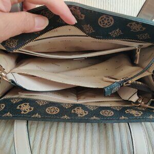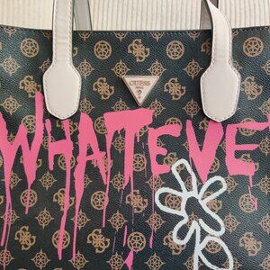 large "graffitied" punk rock vibes Guess handbag in great condition, a couple years old, used but well-maintained, no alterations or damages, original strap included, has 1 outer back zipper pocket in perfect working condition, same with main zipper top close, has 1 internal zipper pocket also in perfect working condition, has internal side pouches, measures 13" left to right externally, 10" tall (excluding the handles), and 5" externally from front to back, stitching and hardware in impeccable condition, fits a clutch wallet, a pair of sunglasses in a hard case, cellphone, keys, and several other purse misc items like travel-sized moisturizer and mirror, makeup, Kleenex, hand sanitizer, hand wipes, firstaid kit, foods, a water bottle, a book, a Chromebook, and a folded sweatshirt