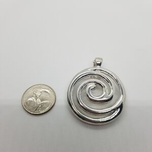 Large silver tone metal pendant in a circular swirl shape. Bail is hinged and fastens with a magnet, making it easy to put on an existing necklace as an enhancer, or slide onto a chain as a solo pendant. In good used condition with no known flaws. Quarter is shown for scale and will not be included in your order.