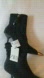 Black tweed ankle boots with interior side zipper. Gold toe detail and pyramid shape heel. Size EU 39 and EU 40. Video is of the size 8 and photo is size 9. All measurements are approximate and taken laying flat Heel: 2.5 inches Boot shaft: 6 inches B13