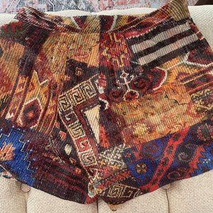 A vintage-inspired tapestry motif gives a statement look to this woven mini.