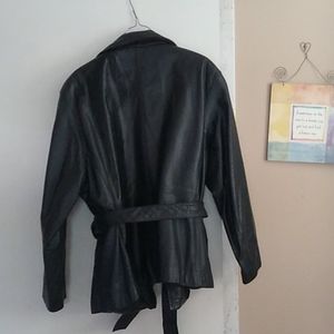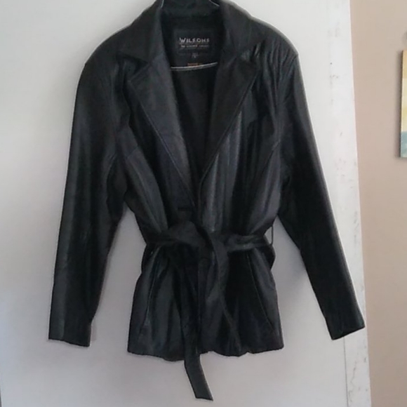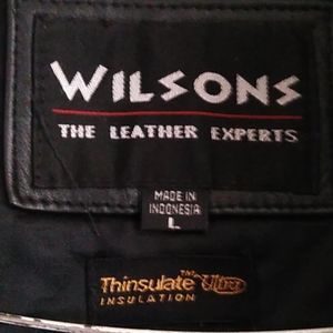 Wilson's leather jacket with a thinsulated liner that zippers in and out, it is wrapped with a leather belt, and buttons in the front, black in color.