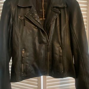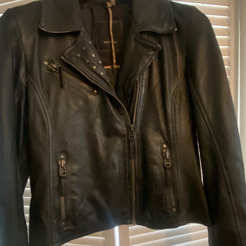 new never worn black leather with white leather star patchwork on the back, this leather jacket is great for warm or cold nights on the town.