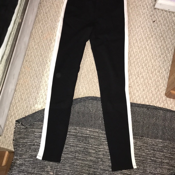 never worn! comfy leggings for dressing up and going out! or to wear casually around the house. black legging with one white stripe down each leg