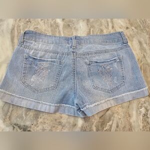 Show off your patriotic style with these l.e.i. Ashley low-rise denim shorts in juniors size 9. Featuring eye-catching red, white, and blue star-spangled flag patchwork and distressed hem, these cotton-spandex shorts are perfect for summer festivals, concerts, or 4th of July. Gently worn and in good condition. Approx. 30” waist and 2.5” inseam.
