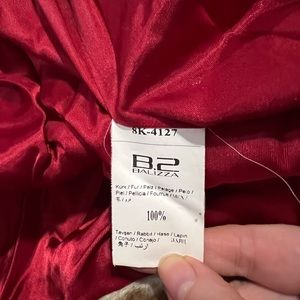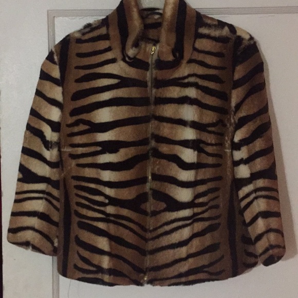 Beautiful, stylish leopard jacket with black stripes! Red material inside the jacket. Slim fit! 100% real fur! Missing little piece on the end of zipper tail, but it doesn’t impact on zipping the jacket