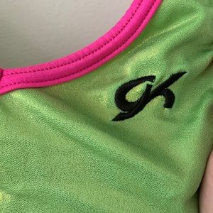This leotard by Gk is green with the sides being like a cheetah/animal print.