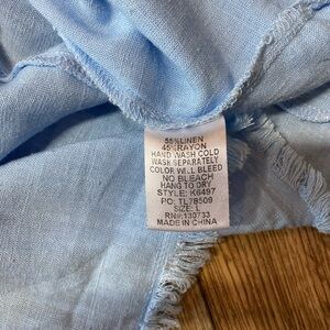 The top has a relaxed fit and a slightly oversized silhouette, typical of the brand's style. It features a button-down front with white buttons, a collared neckline, and short sleeves. The hem of the top is frayed, adding a casual and bohemian touch. Open to offers and bundle items to save!