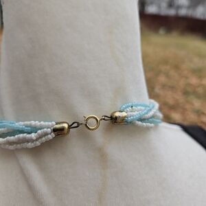 Necklace with several strands of seed beads in pearlescent white and light blue colors. In good used condition. Measures approximately 18"
