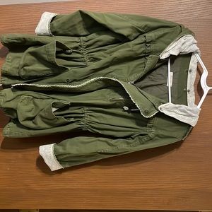 Olive green denim jacket with lace details, waist and bottom draw string, metal zipper and snap buttons