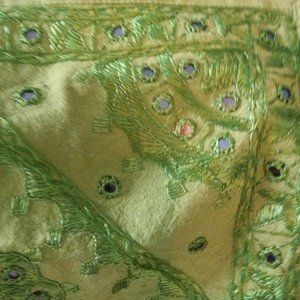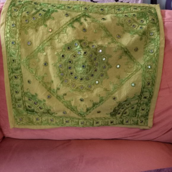 16 x 16 pillow cover with slip-in closure on back, front design features embroidery and mirrors, gently used and in excellent condition