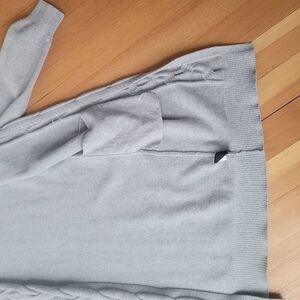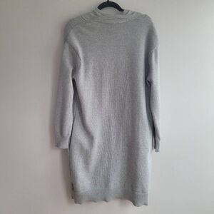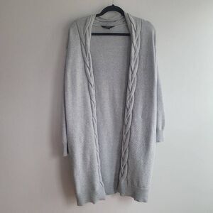 Light grey longer length open front cardigan with braided details long sleeved with inside pockets. In excellent pre owned condition with no damage, there is a tiny spot of wear on the front where the pocket is connected on the inside as shown in photos but it's otherwise flawless. d13