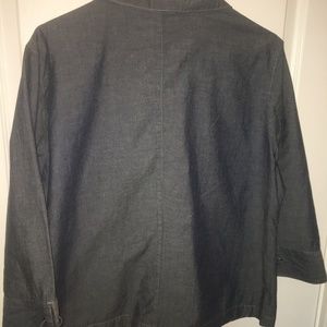 Chico's light weight jacket in blue. Covered fabric buttons with upper pockets and faux pockets to the bottom. Loose fitting around bottom of jacket and 3/4 sleeve. Note: size 2=L