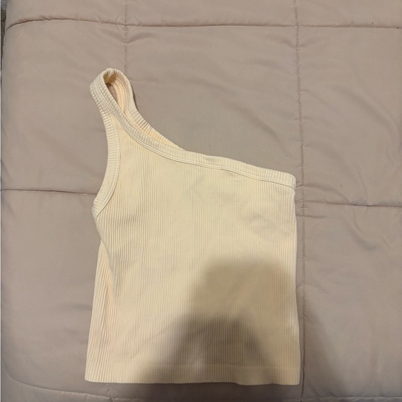 one shoulder baby yellow top one size, fits like a small or XS. only worn a couple of times, the back has a little something on it but can most likely come off easily. in good condition otherwise!!