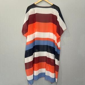 Add a pop of color to any outfit with this flowy striped open-front cardigan/kimono 🌈✨. Featuring bold horizontal stripes in orange, blue, burgundy, and cream, this lightweight layer is perfect for throwing over jeans, dresses, or even swimwear. The relaxed, drapey fit makes it a versatile piece for everyday wear or vacation vibes.