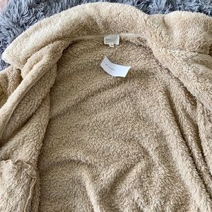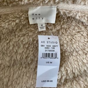 AE studio brand, TTS with other American eagle pieces. Cozy but lightweight - not nearly as heavy as other teddy and Sherpa coats I’ve tried.