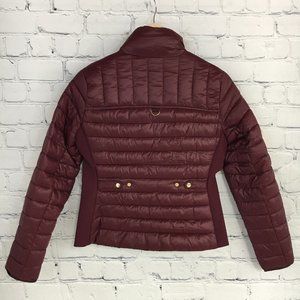 lightweight puffer, burgundy (beautiful color!!), front zip closure, 2 side pockets w/ zip closure, slim fit silhouette, waist length bodice, lightweight, padded, 100% nylon, brand new boutique item, runs on the small side: