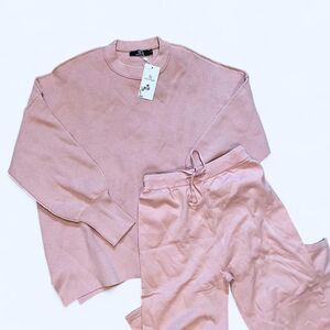 blush pink sweatpants set - high-waisted, wide-leg pants with a relaxed fit. super cozy brown set that’s perfect for wearing on road trips, at the airport for a long flight, etc. so you’re comfy but also look put together. oversized fit on the crew neck sweater. both knits are a size small. brand is lillusory brand new with tags. has a small snag on the front, which is shown in the photos #loungewear