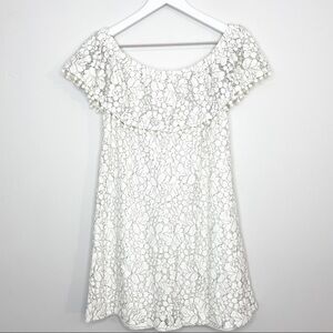 Lily Rose White & Black Floral Lace Off Shoulder Ruffle Pom Pom Dress. Fully lined.