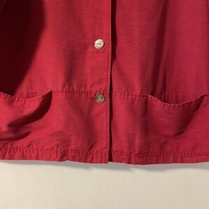 linden hill 100% silk two pocket button front shirt jacket size X. Silk has a bit of texture to it. Feels breathable and nice on. Lovely wine red color. Shell buttons.