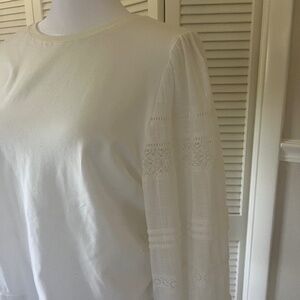 a love a knit top with Linen and lace sleeves size L. Great top for anytime of year. Knit top make of cotton and Spandex so it holds its shape well. Sleeves are 100% cotton with lace bands. Shorter length. Purchased new from Dillards. Kept in smoke free environment.