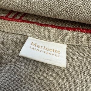 A linen chicken themed table cloth with red stitching. Made by Marinette Saint-Tropez. 160x160. There are five matching napkins that have never been used and have the sales stickers still attached($8.00 dollars each) There Is also one additional napkin, but it washed and is a little smaller. The table cloth was used only a couple of times. There is some pulling in the corners. see pictures