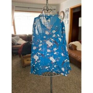 Lovely royal blue sheer blouse with white floral print and belled cuff.