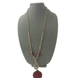Stylish retro 70s disco style long chain necklace gold tone with round red pendant in good condition likely vintage great for holidays going out parties gifting work vacation school art deco boho retro twee casual preppy glam grunge coastal grandmother cottage rave
