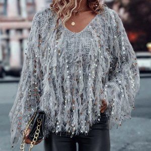 long sleeved fringe details V-neck Knit Sweater top gray